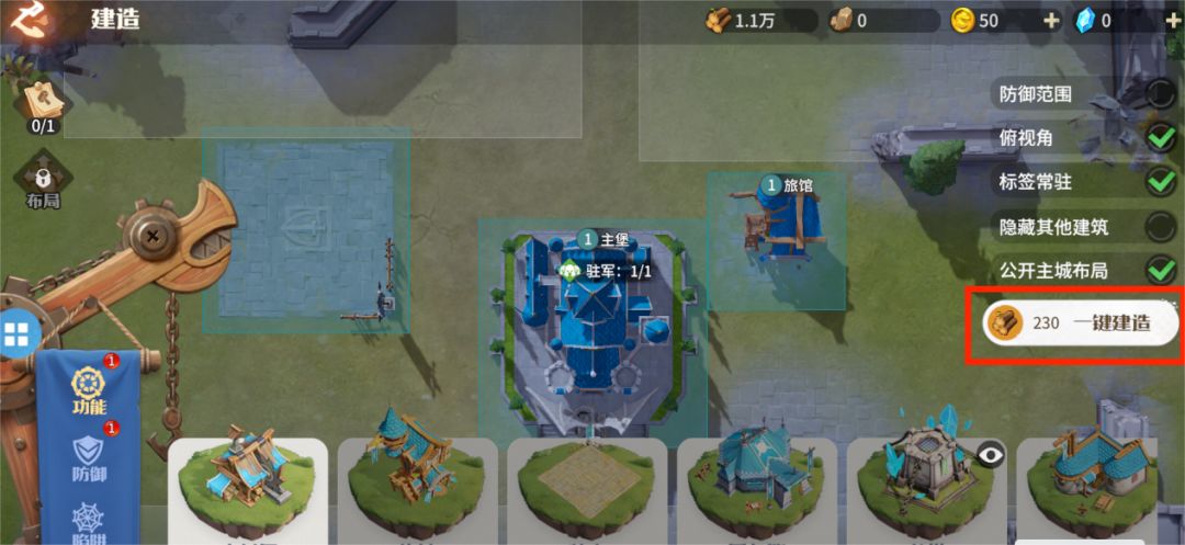 一直做章节任务到第8章,中途不会摆放建筑的,建议可使用一键建造