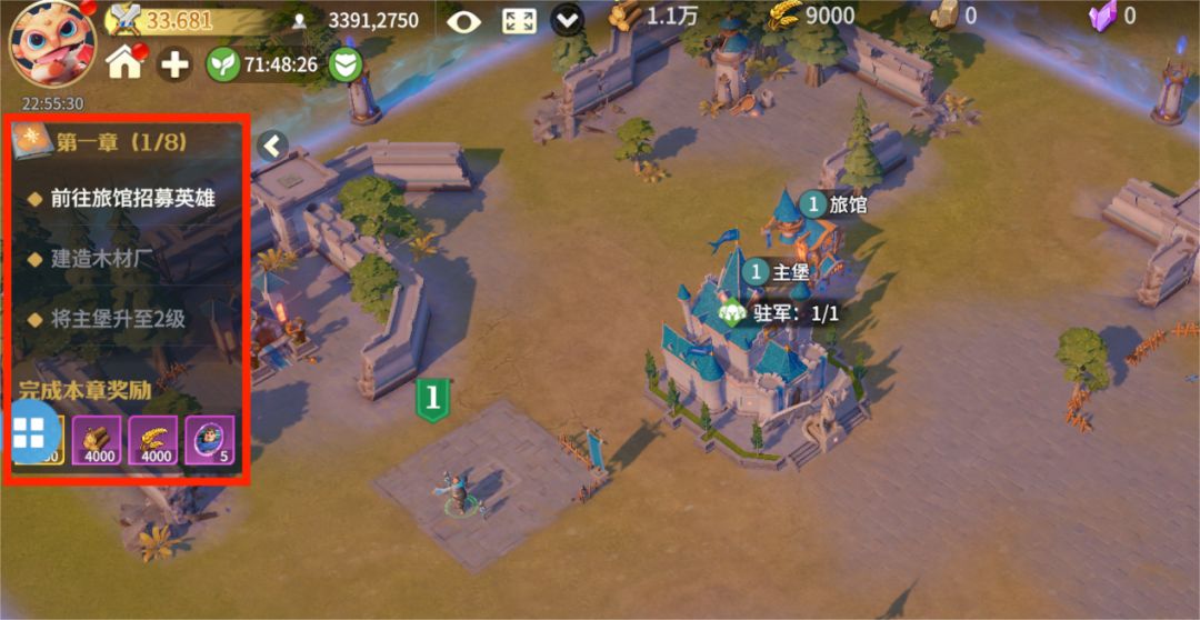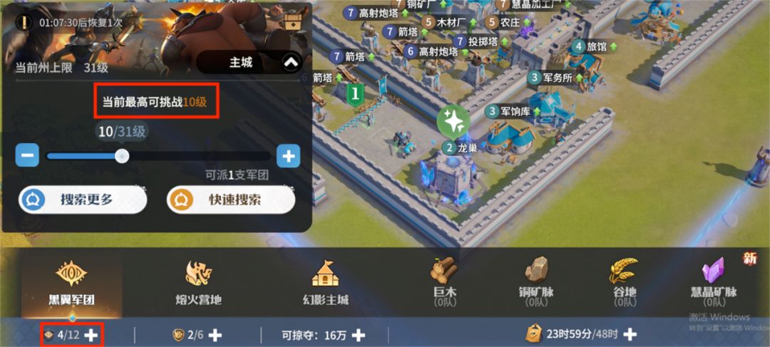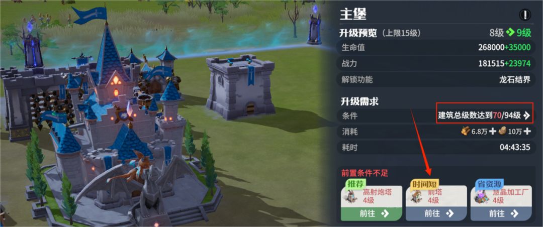 到了第10章以后,可以暂停章节任务,先升堡等级,速堡流优先点橙色推荐,时间短的建筑优先,快速满足升堡条件,这样能更快的速堡提升战力,打高级黑翼达到极限发育的效果