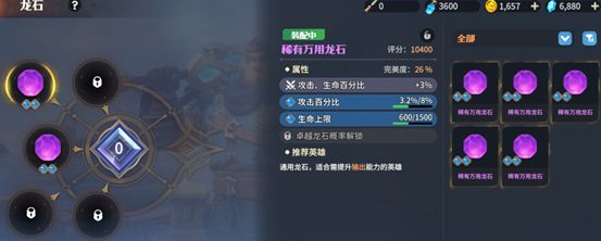 英雄到达15-25-35-45-55等级时会开放龙石凹槽,每个龙石可增强英雄属性,触发专属套装效果还能增幅英雄技能