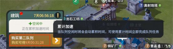 建筑的空闲时间在不升级建筑时会自动积累,不需要一直保证有建筑在建,也降低了肝度,另外第2队列必须购买,累计加速两个队列可叠加累计时间,所以新手期第一时间金币足够388以后直接购买即可