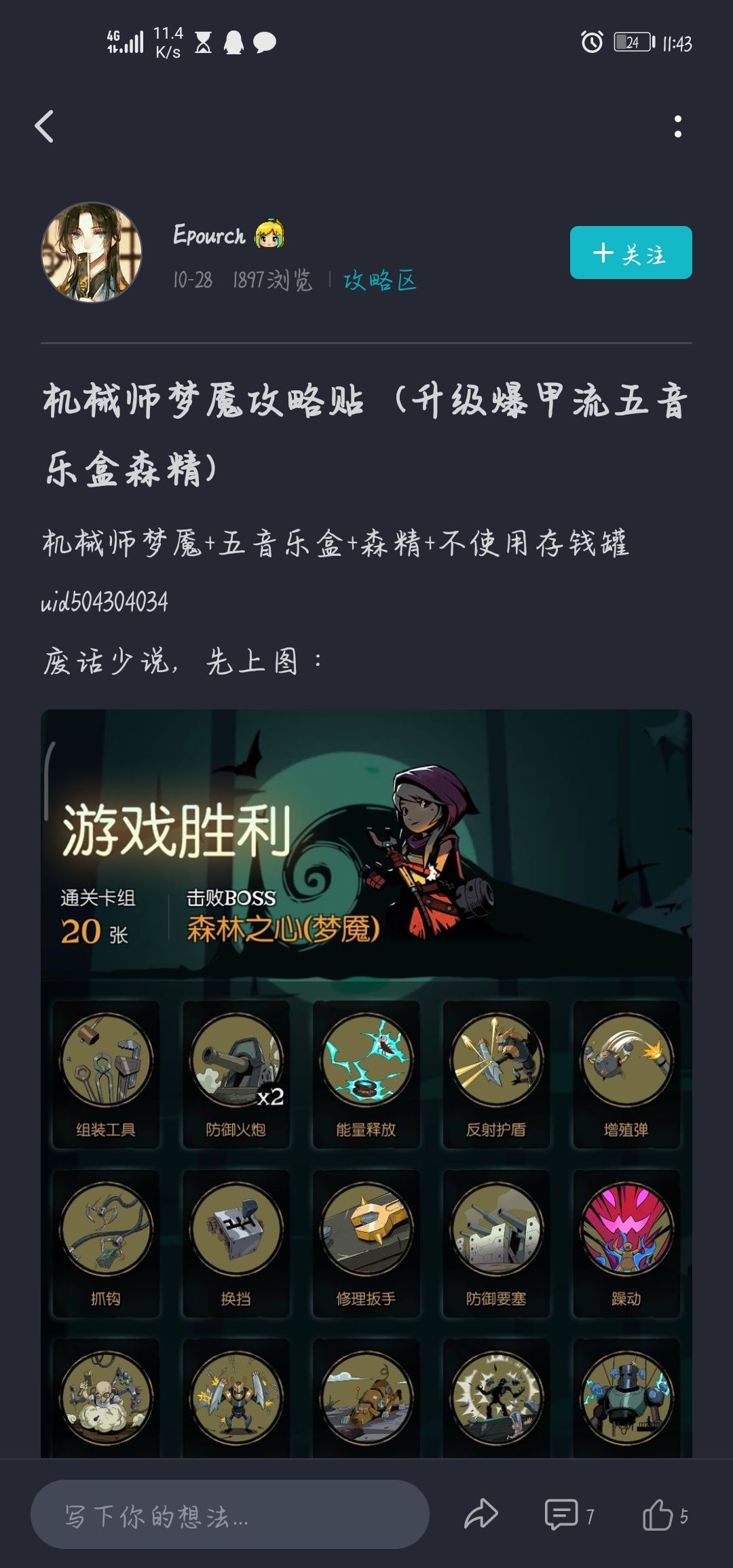 菜鸡写一下五乐章梦魇通关纪念吧,不知不觉玩了几十个小时了。因为我很喜欢机械师这个设定(只要游戏里有机械师角色我都是一路打到底的XD),所以从普通一路打到了梦魇森灵(当然查了不少攻略XD),我看的是P1@Epourch的攻略。因为我本人的关系所以和大佬的卡牌不是一模一样_(:з」∠)_