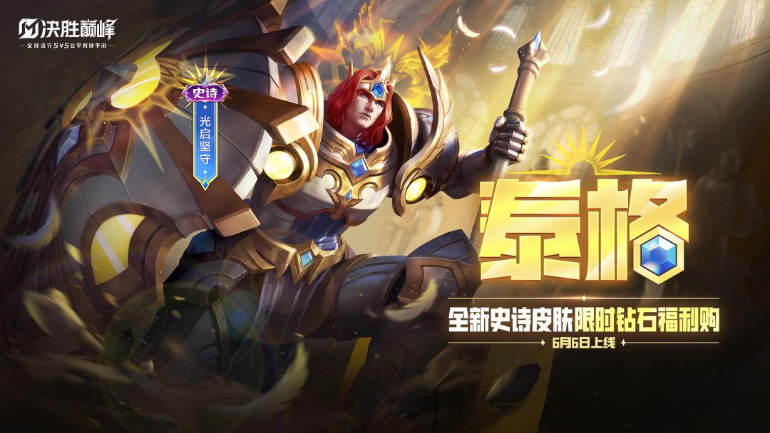 6月6日,泰格全新史诗皮肤「光启坚守」将正式上架【商城】,售价880限时钻石,各类活动赠送的限时钻石都可以用于兑换该皮肤哟!喜欢「泰格」的友友们千万不要错过啦~