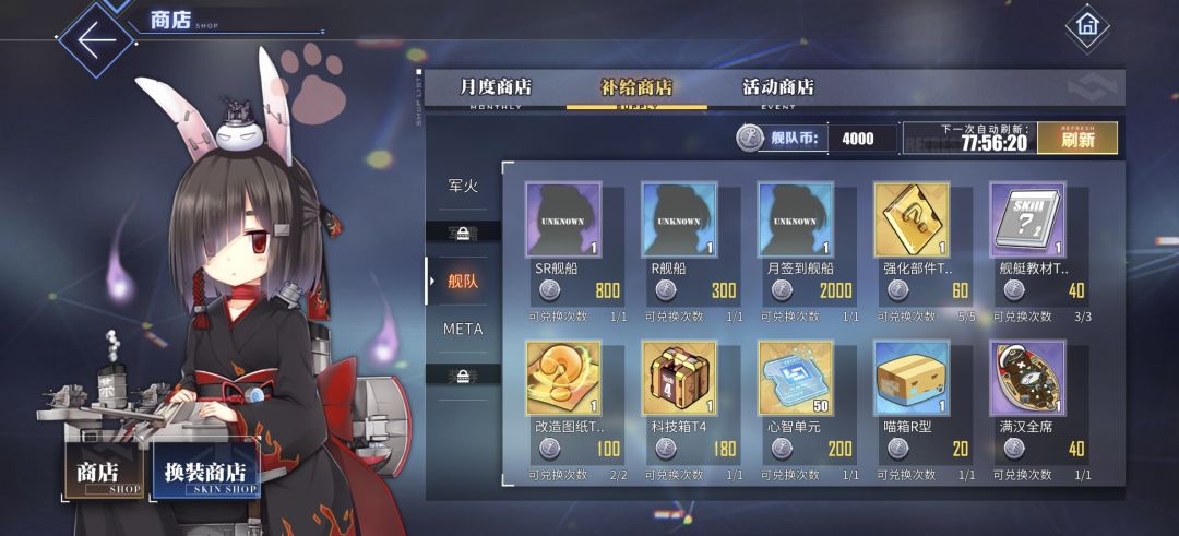 新服开服活动:优先给独角兽换改装材料,之后换抽卡用的建造券,新手40抽能拿到一个企业,无脑培养就行