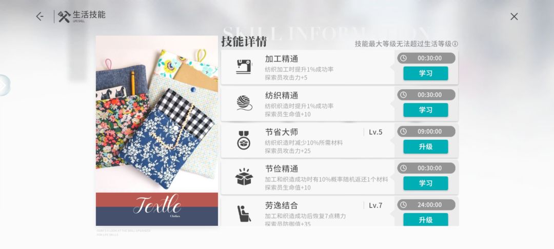 在到达纺织等级2、5、8前,请勿升级技能。