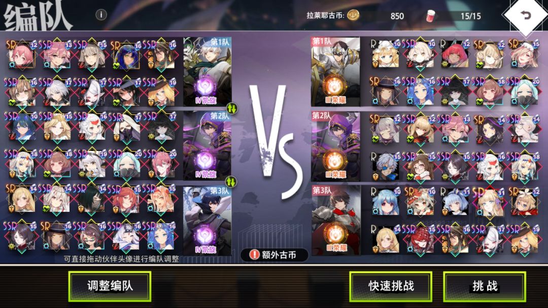 不夜游艺船采用3局2胜制,双方各自3个队伍,一共进行3场战斗,赢得2场即为比赛胜利;每个队长和伙伴只可在3个队伍中上阵1次;