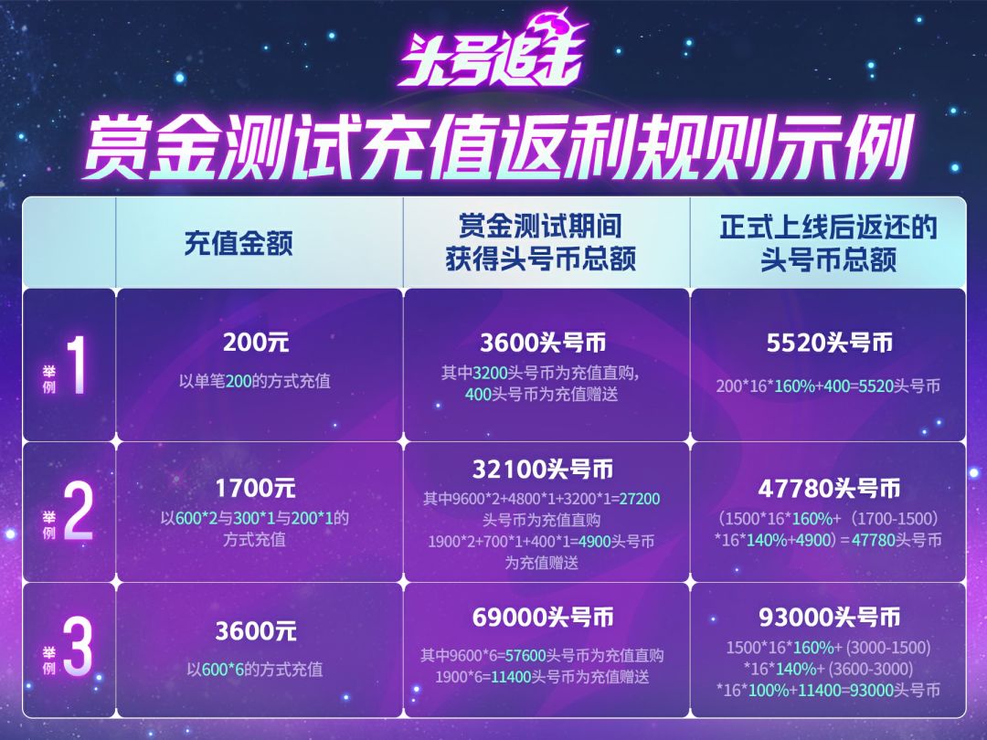 充值返还计算说明:正式上线返还的头号币=充值金额*16*返还比例+充值赠送部分