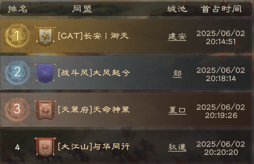 关键时刻【CAT】再次展现爆发力,20:14:51建安城破,【CAT】成为1区首个夺下二级城的同盟!这个速度也是双服第一,含金量十足!
