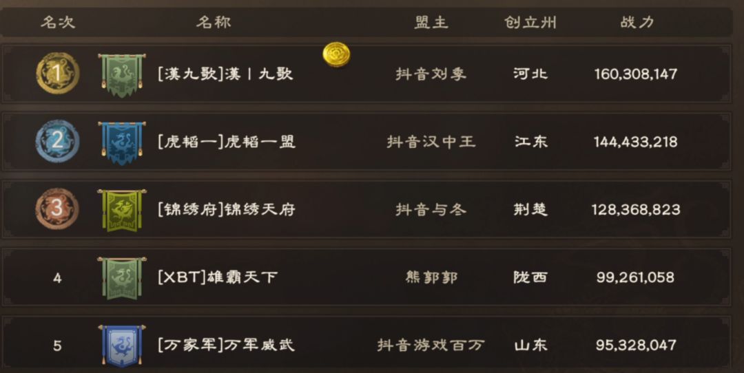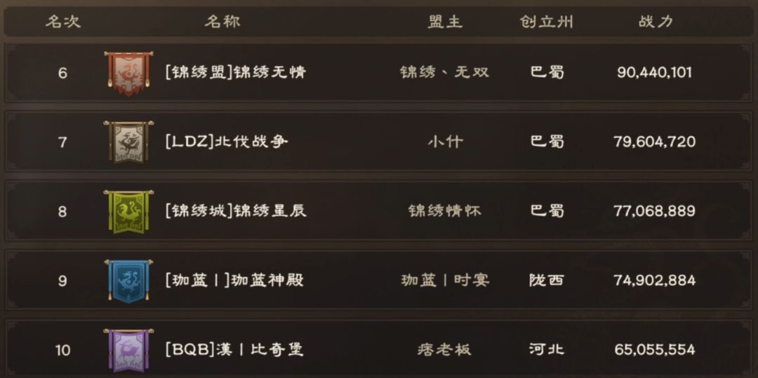 2区备战情况则与1区大为不同,【漢九歌】以1亿6030万战力成为双服战力第一的同盟,排名第二和第三的【虎韬一】与【锦绣府】也没有落后太多,但2区中游同盟战力存在一定程度的断档,也就是说战力排名靠后的同盟只要拿下二级城,照样有挤进前六的机会。