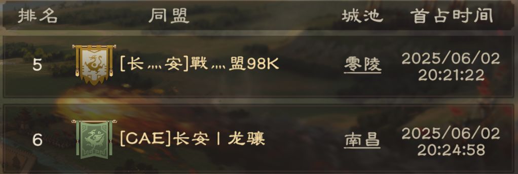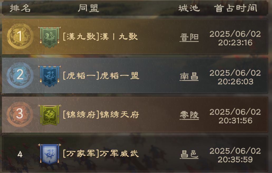 2区用时稍久,但由于时间相近,竞争激烈,20:23:16,【漢九歌】终于入主晋阳,巩固2区魁首地位。