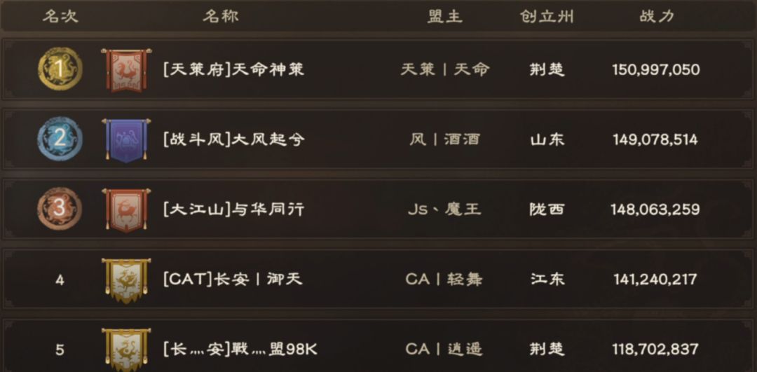 二级城开放前各大同盟战力猛涨,【天策府】以1亿5099万战力夺得同盟战力榜榜首,【战斗风】和【大江山】也紧随其后,分别以1亿4907万战力和1亿4806万战力位列第二和第三。