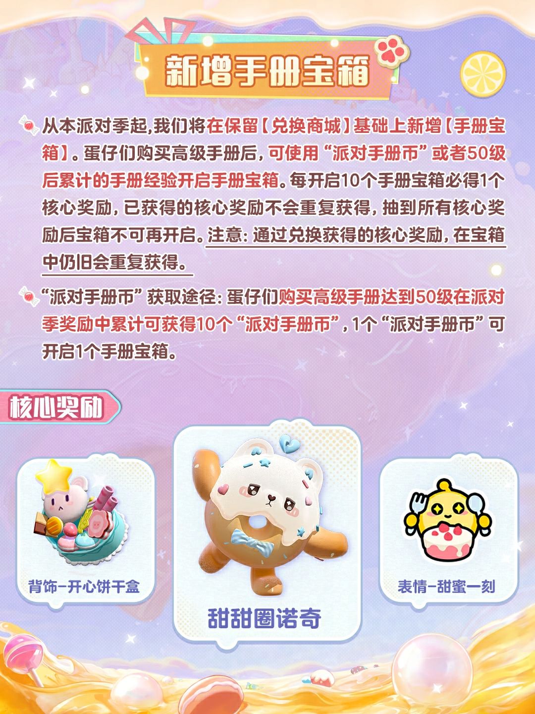 💗从本派对季起,派对季手册将在保留【兑换商城】的基础上新增【手册宝箱】,各位可自由选择获取奖励的形式——蛋仔们可以按照以往规则使用50级后累计的手册经验直接兑换心仪奖励;此外也可以使用50级后累计的手册经验或“派对手册币"开启宝箱,每开启10个手册宝箱必得1个核心奖励,已获得的核心奖励不会重复获得。