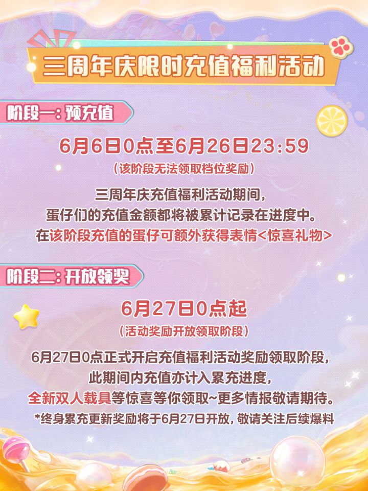 【阶段一】预充值:6月6日0点至6月26日23:59(该阶段无法领取档位奖励)