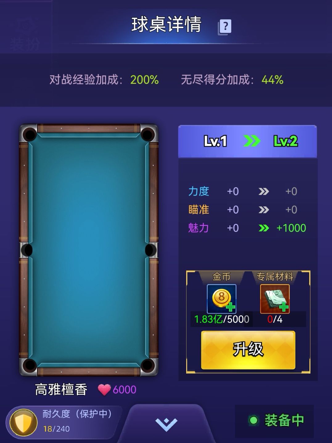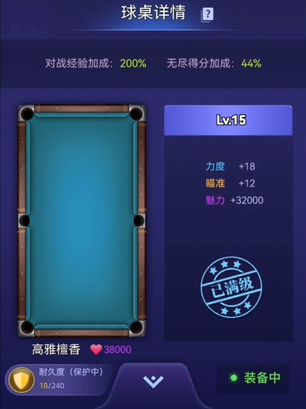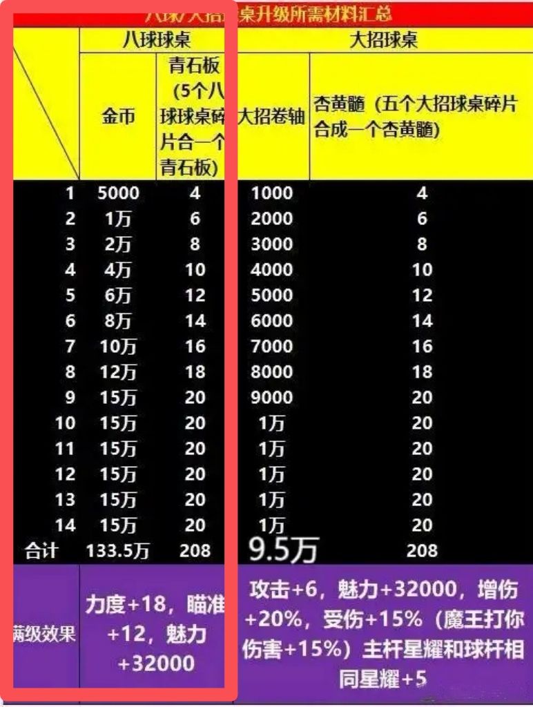⚠️普通球桌满级增加力度+18,瞄准线+12,魅力+32000。共计需金币133.5w,青石板208个(折合球桌碎片1040个)。