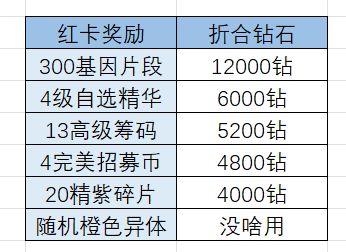 2.这次小活动奖励比起上次整体价值都有提升,尤其是300基因片段,出2次就能稳定换1个指定范围的英雄。正常小活动166玩家的副产物总体价值是18000钻,这次就算3次单红基因片段,也有36000钻的价值,更何况2红3红还能赚更多,理论上限2700基因片段(也没必要一直费钻石刷新,2红带基因片段就行)。
