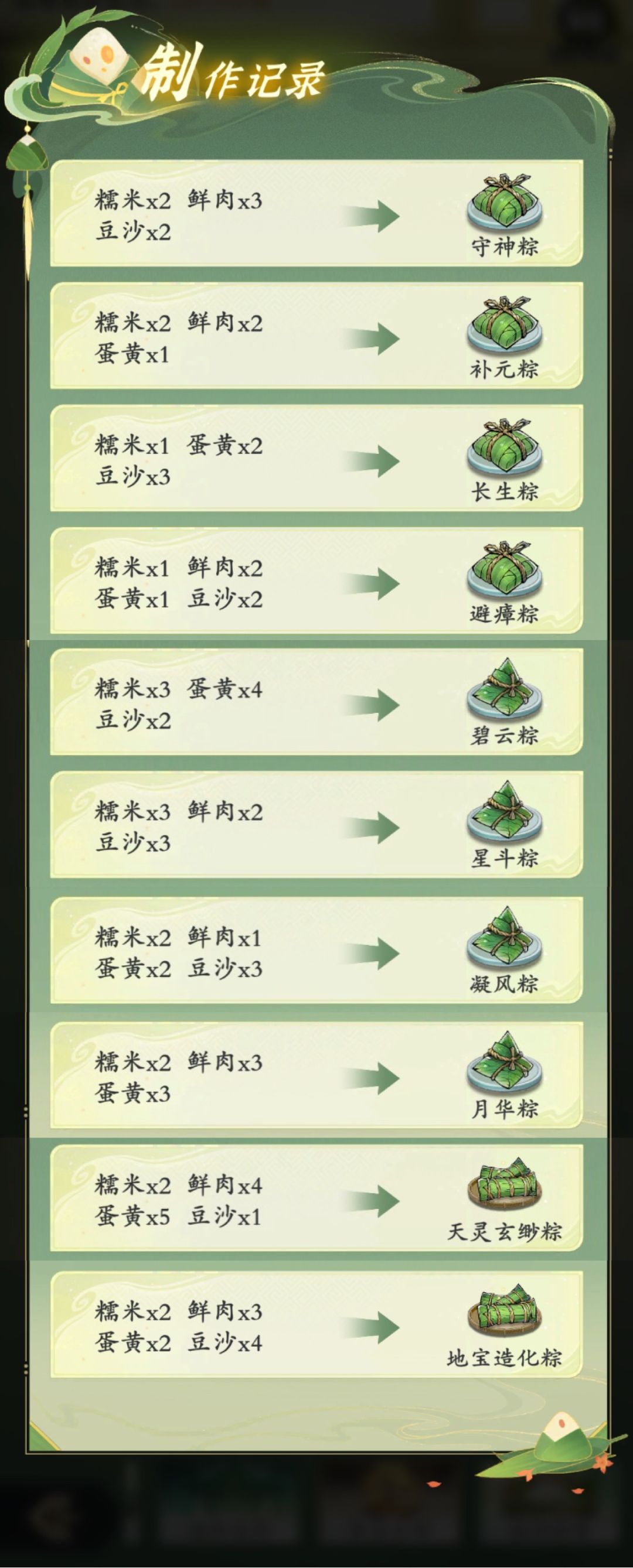 - 避瘴粽:糯米 x1、鲜肉 x2、蛋黄 x1、豆沙 x2