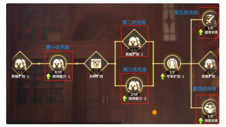 优先提升编队1和编队2的军团英雄和士兵容量,其次提升属性,保证前期开荒顺畅。