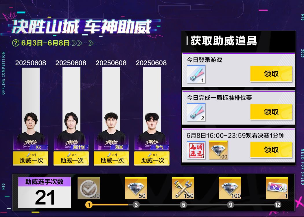 活动期间,每日登录游戏,并完成标准排位赛,可获得助威道具为喜欢的参赛选手助威,达到一定助威次数还可解锁惊喜奖励!