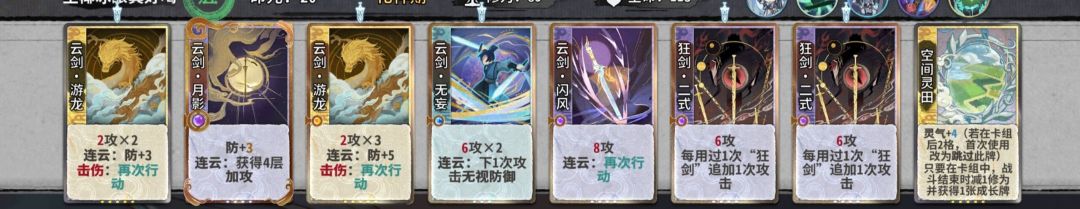 化神成型卡组:化神期的核心牌有连环和御空以及化神悟剑牌,御空吃幻轻剑后接连环能三动三计数,护体丹留着博弈,正常的成型卡组是把好用的悟剑牌摆上增加狂二计数再用狂二斩杀,灵活用连环去接悟剑牌。