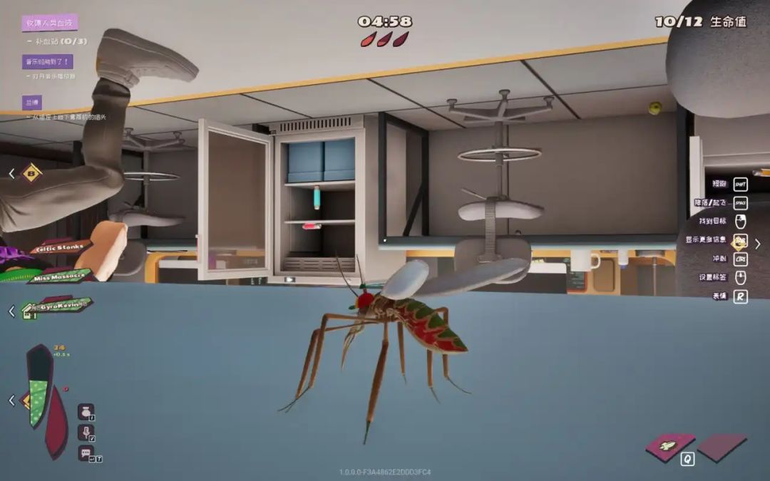 终于轮到我当蚊子了随后是蚊子一方,蚊子的任务很简单,就是吸血随后填满所有血包,在逃生出口开启时撤离获胜。这里有个小技巧得跟大家说一下,操作蚊子吸血时,吸的越多速度和体力恢复便越慢,因此如果前期吸的太慢,人类很会玩的话,很容易死亡,因此建议量力而行。