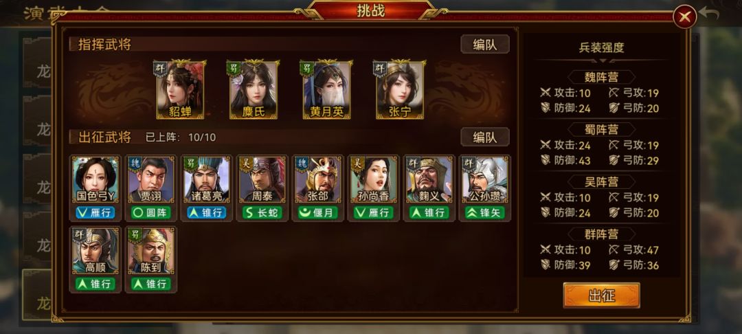 麴义高顺陈到3人二级锥形(10级特种兵0训),国色弓贾诩诸葛控制加布阵,全员满兵,指挥尽量加防御。