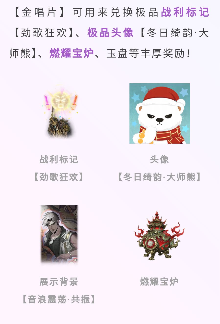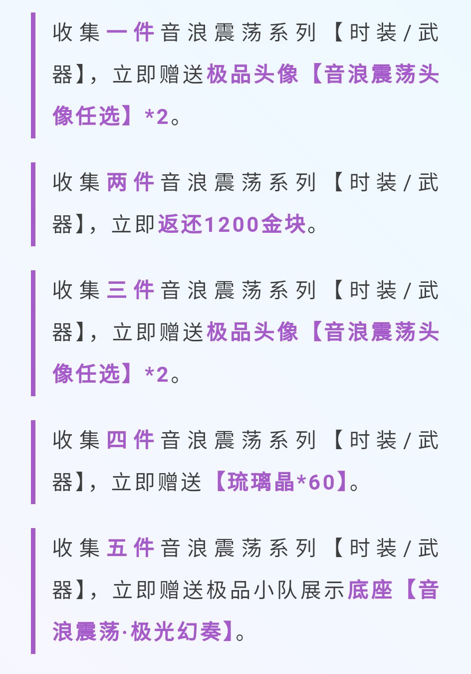 活动有两个,一个是大众活动,奖励就那样吧,一个是促销活动,除了图上的,如果买音浪震荡全套皮会返1500金砖。