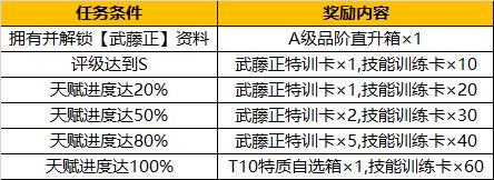 【活动说明】活动期间,达到指定天赋养成条件,即可领取武藤正特训卡,T10特质自选箱等海量好礼。