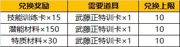 【活动说明】基础养成资源不够?那么来交换吧!活动期间,您可以使用武藤正特训卡来和我们交换基础养成资源哦,再也不用担心手抖买多特训卡咯。