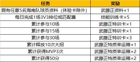 【活动说明】活动期间,集齐任意五个海南球员资料(体验卡除外)的篮球手,即可前往活动大厅免费领取武藤正球员资料x1,使用武藤正技能完成指定目标即可获得更多超值奖励。