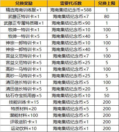 【活动说明】活动期间,使用海南集结纪念币更可兑换精选海南训练服、武藤正特训卡、武藤正专属特质箱等缤纷好礼。