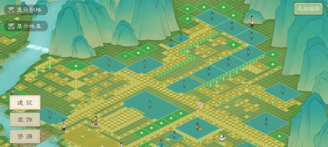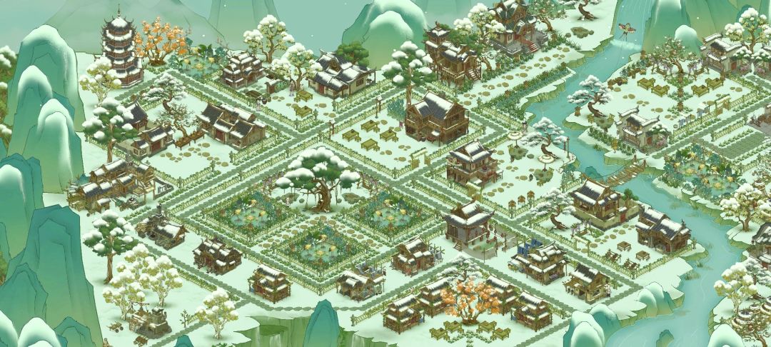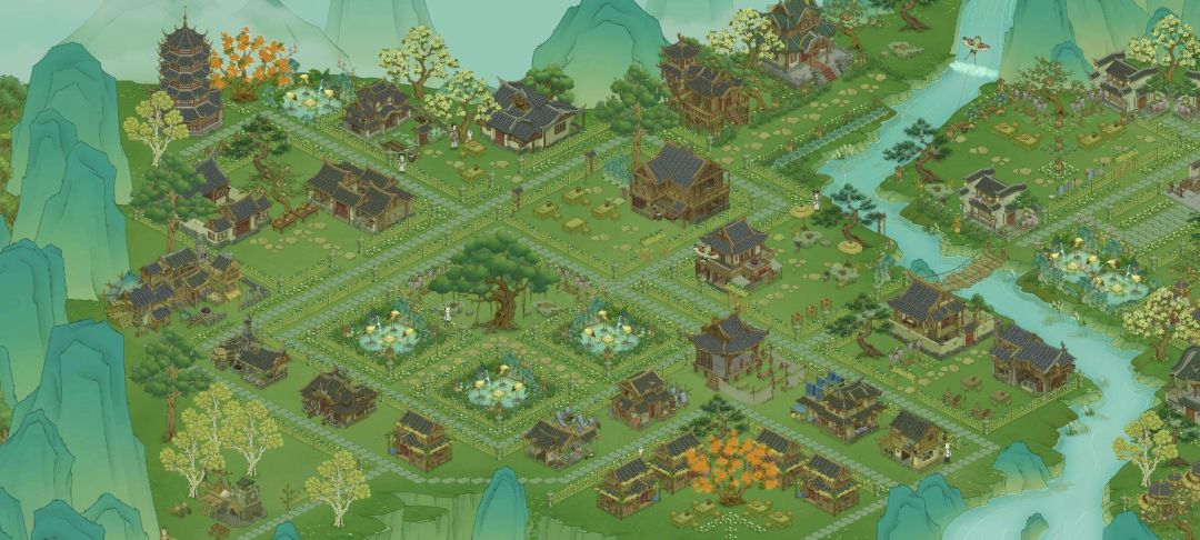 6.上层区左侧,商业娱乐区,以大榕树为中心布局中心公园,四周在扩展出酒楼,茶楼,布庄,药房等商业元素,主基调以石瓦为主,做到颜色统一。