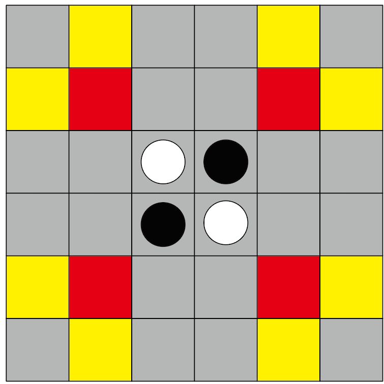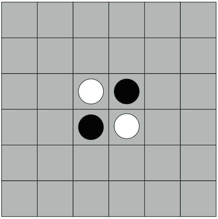 开始的时候如下图所示,我们在6×6的格子里下棋,且初始有黑白各2子,我们执黑子先手。