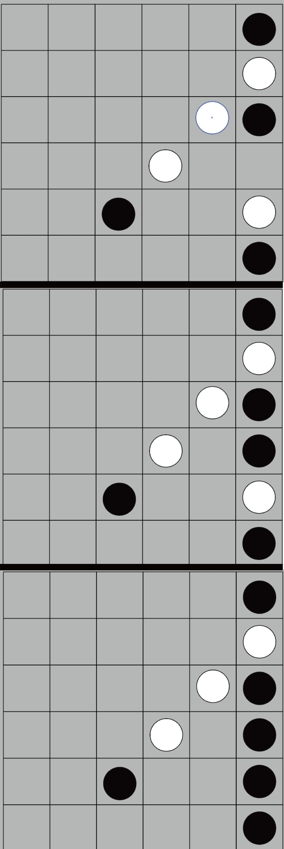 最后,假如出现如下位置的布局,即我们占据上面绿色区域的一个边,而电脑的四个白子连成横着或者竖着的一条线,我们一定要直接吃他4子,这是绝佳的机会。