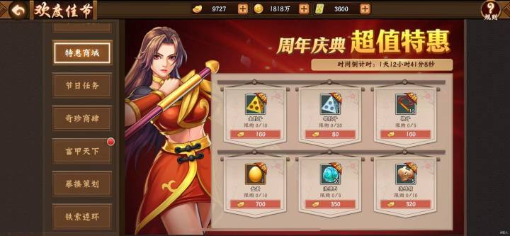 6、特惠商城,金银骰子需要按需购买,可以最后一天根据富甲天下活动是否完成5轮来决定购买数量;鞭子如果需要拿暴揍策划的“五谷丰登”称号需要要买4次才够,称号加双攻300,看个人所需吧。