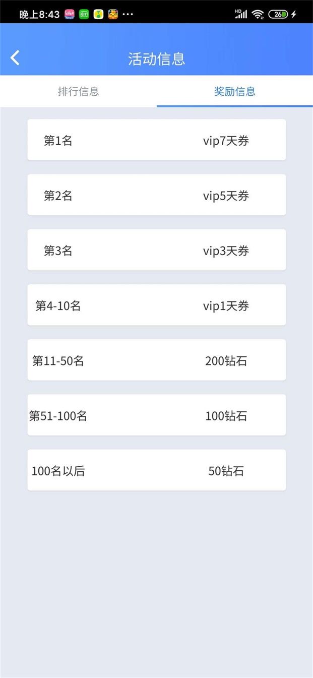 6)活动持续一段时间,系统根据用户的战绩排名派发对应排名奖励