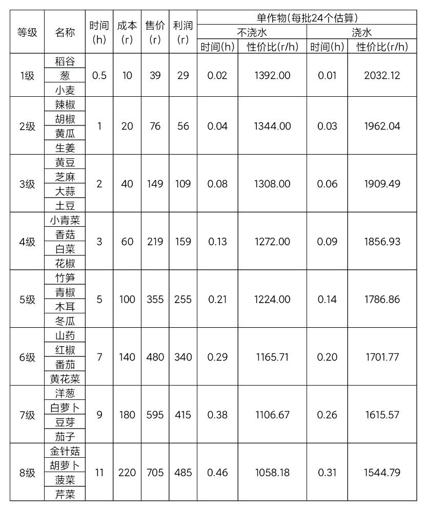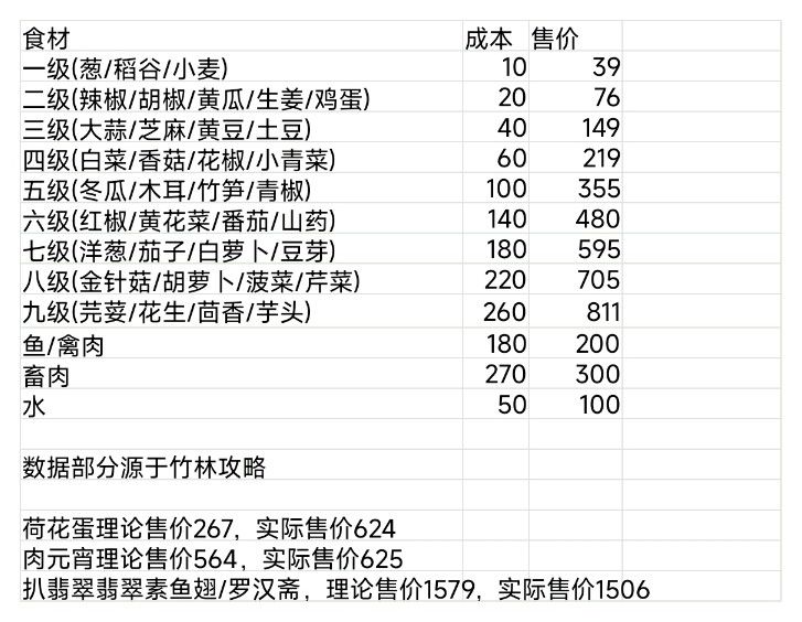 畜肉优先肉元宵,鸡蛋优先荷花蛋,禽鱼优先二级菜(高级食材充足情况下晚上睡觉前种6级7级食材,禽优先老鸭煲,鱼优先剁椒鱼头/松鼠桂鱼),性价比最高为炒米、葱油饼