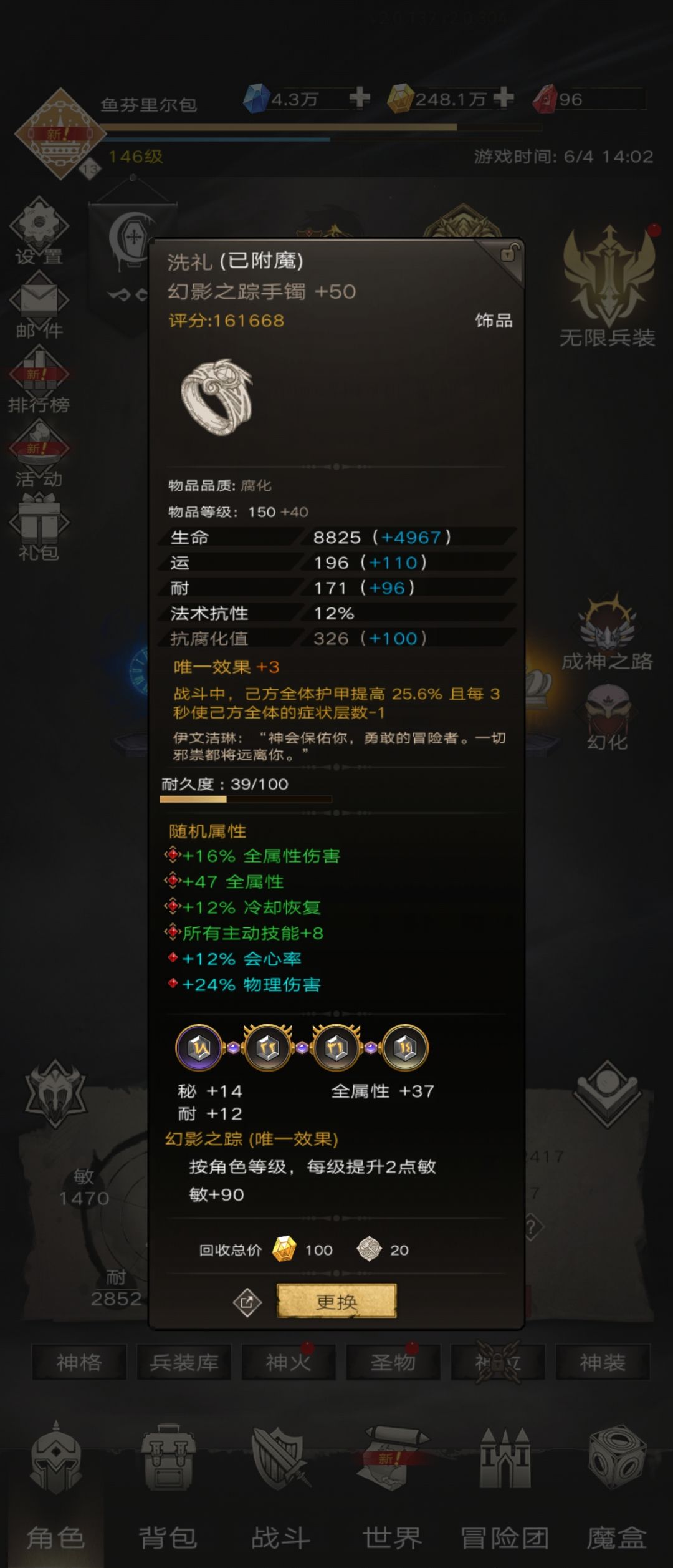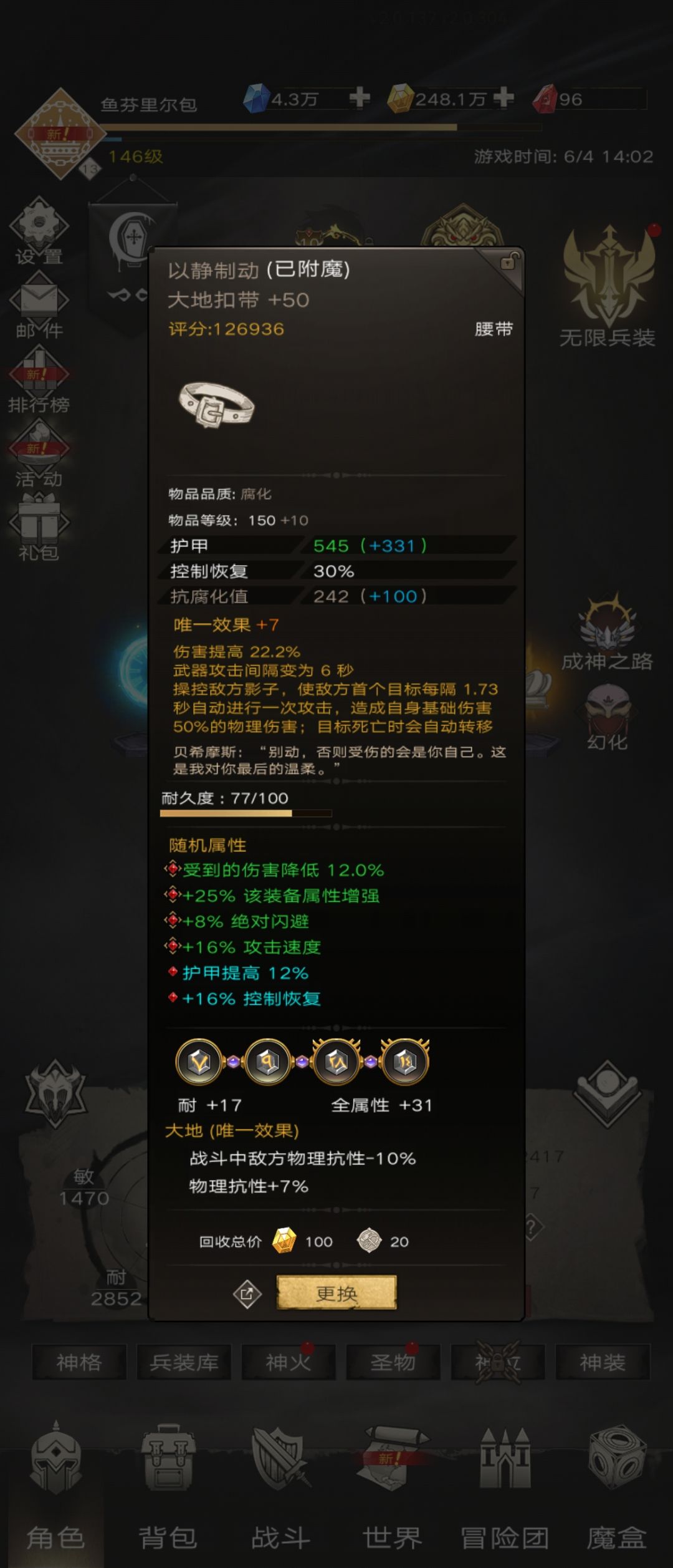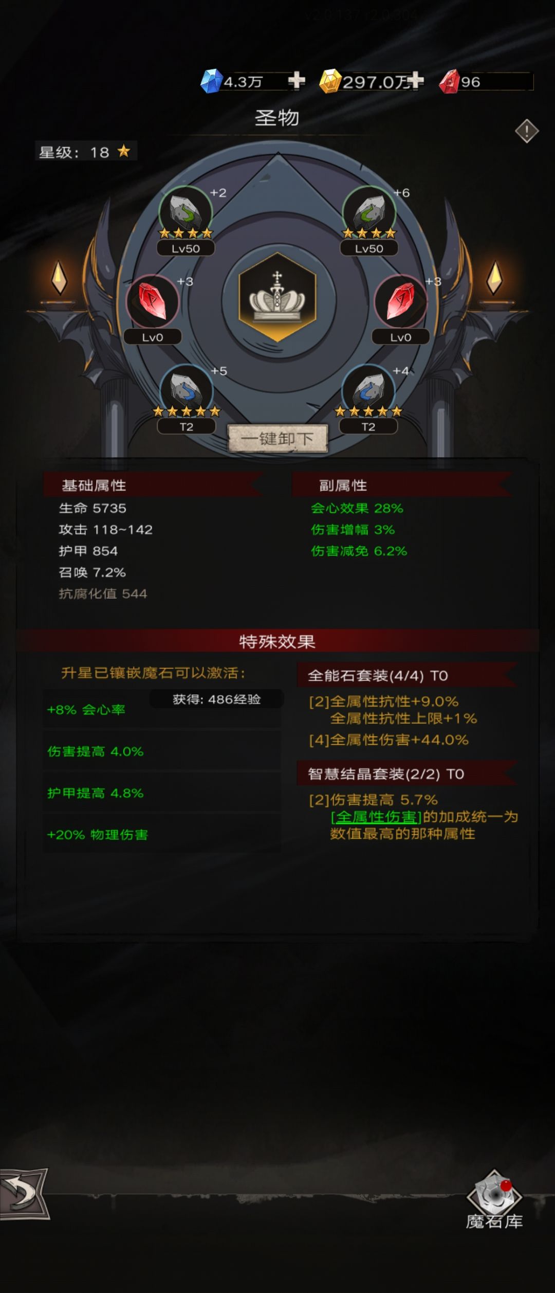圣物前期还是选择了智慧结晶2件套+全能石4件套,裁纸刀有个很尴尬的地方,圣物他能用的特别少,目前来看只有T90的深海守护或许有用。我试过星图点出来炼金术士,然后带憎恶套,结果发现裁纸刀根本扛不住持续伤害,10层中毒毒三下就死了。领主之证可以换成加伤害高的。