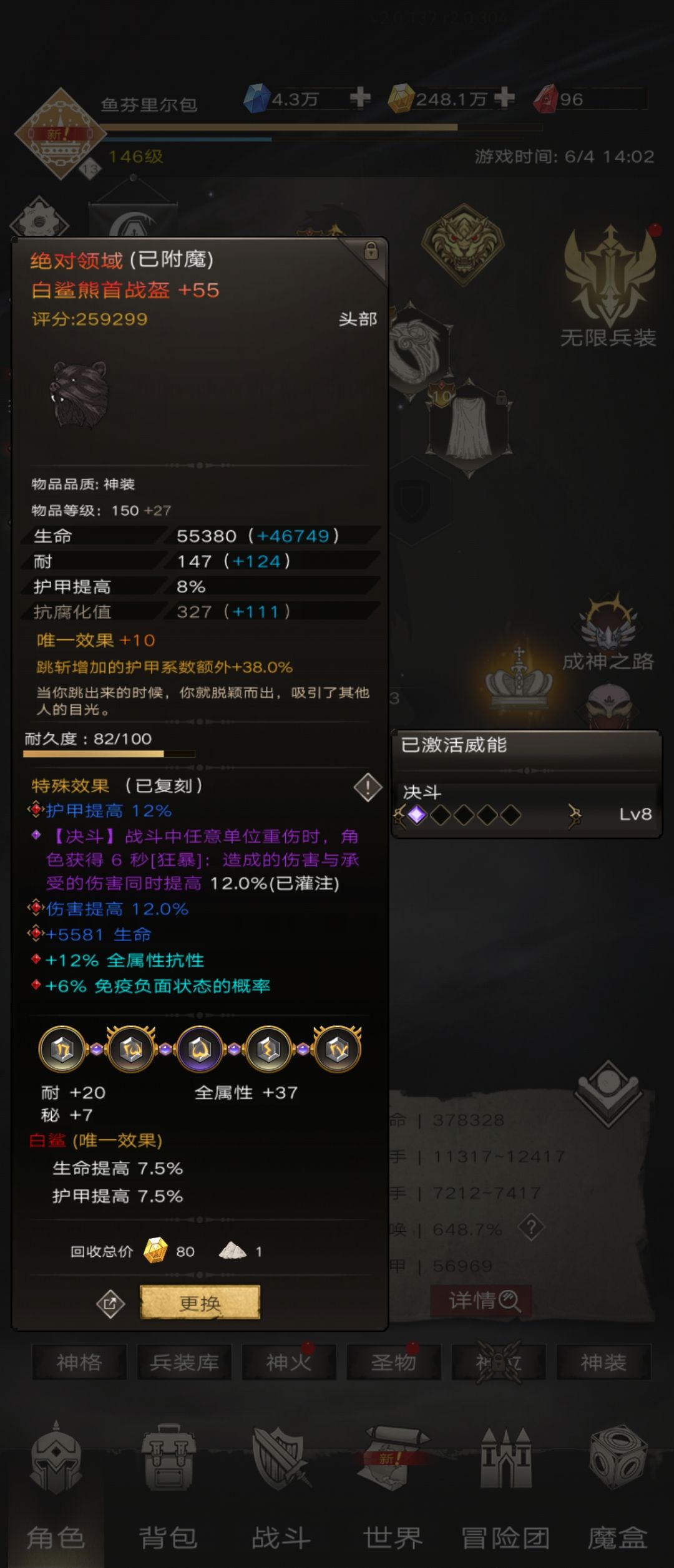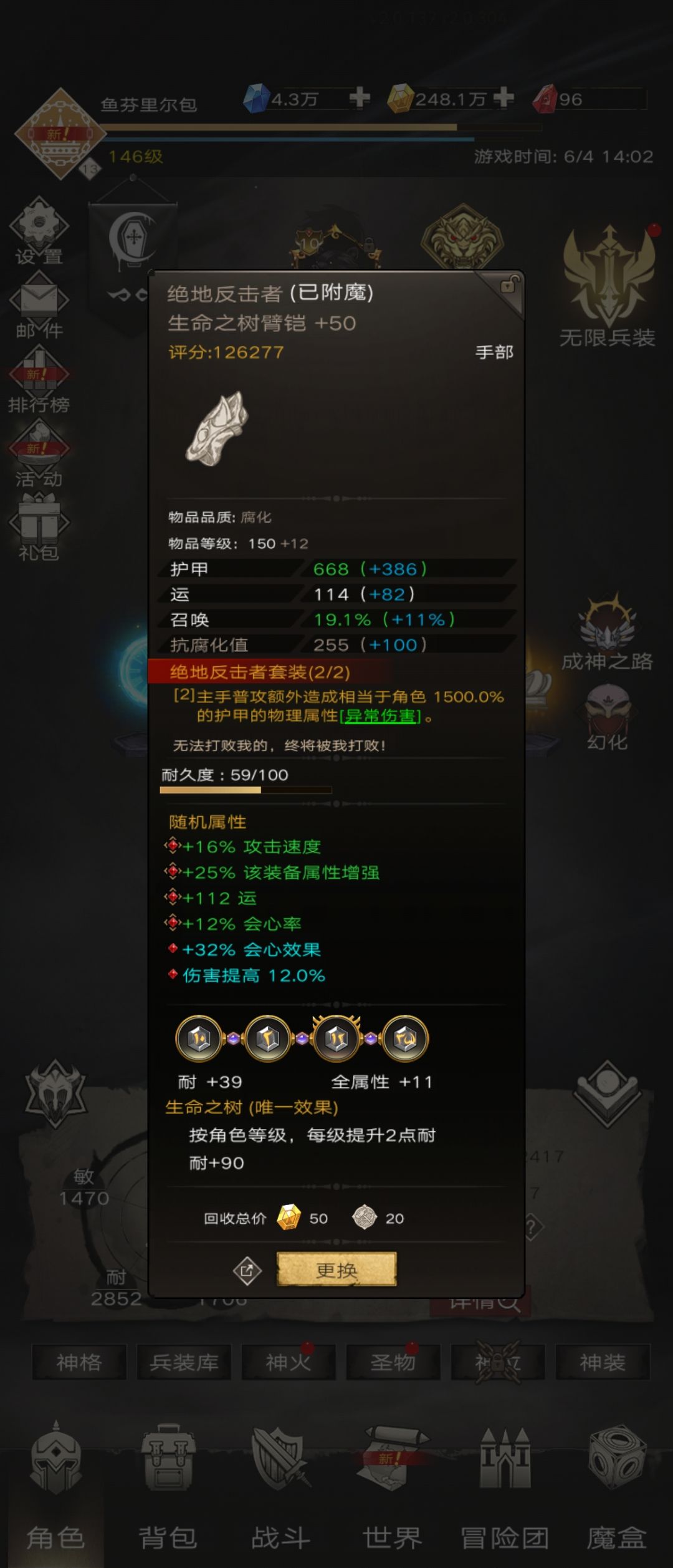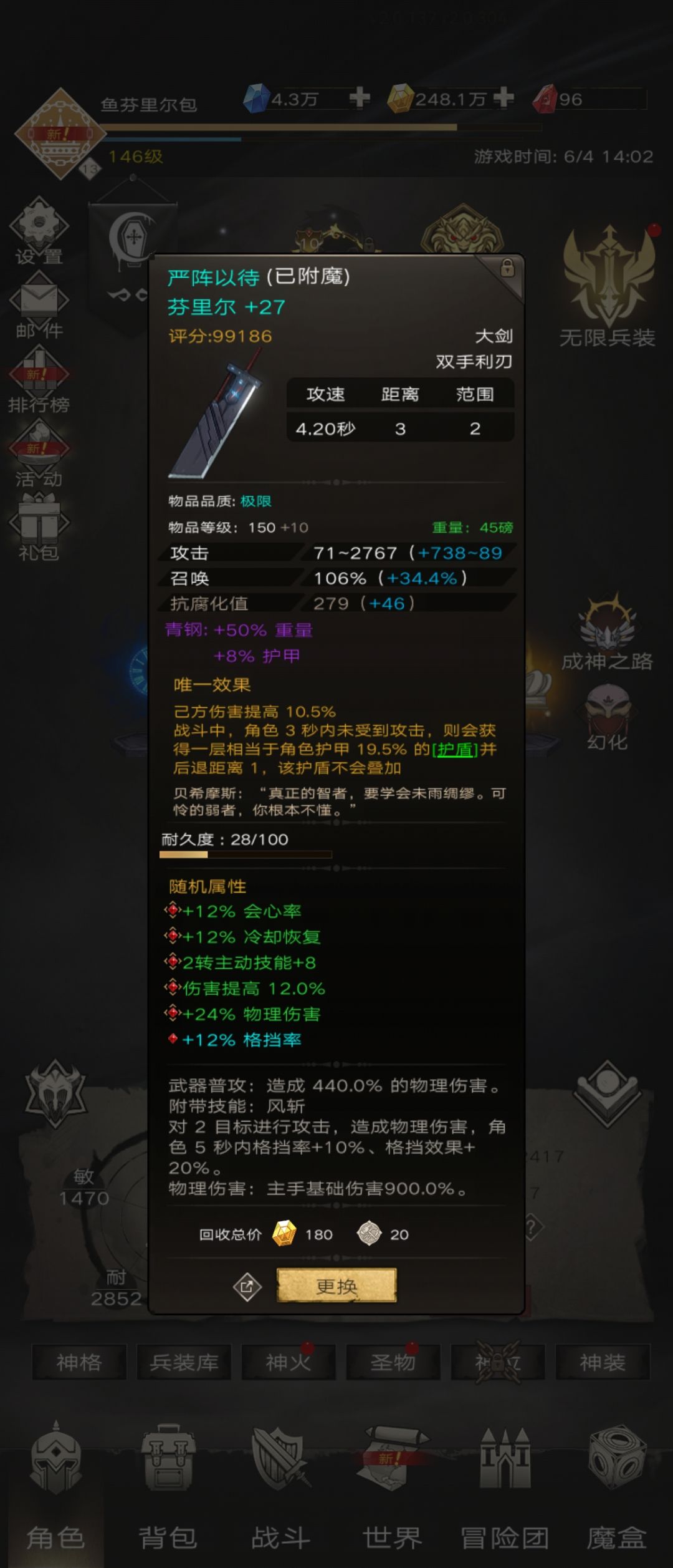 前言:芬里尔的强度并不是特别高,如果是以为新兵装强度高所以才玩的话,不是特别建议玩。这个兵装如果想要解锁54000%倍率的大招必须要六星满超限,如果没有六星满超限伤害会少一截。毕竟大招是整个兵装技能唯一的高倍率输出技能。芬里尔还是个需要堆护甲,格挡,会心,冷却,攻速,攻击力的超级兵装。算是偏后期才能厉害的,此攻略仅限前期,即150级万神T85。