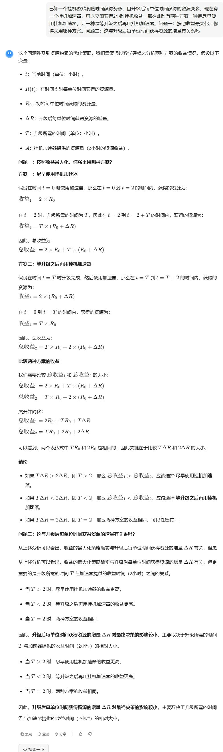最新修改:此游戏中讨论的场景是地图卡等级,你会选择先用时间结晶,尽快达到要求的等级,还是等到这张图女神像开了(获得经验会增加)之后再用时间结晶。评论有小伙伴拿真实的数据进行了讨论,发现两者的收益是相等的,请警惕AI的胡编乱造,我脑子有点不够用了,留给有缘人去讨论吧