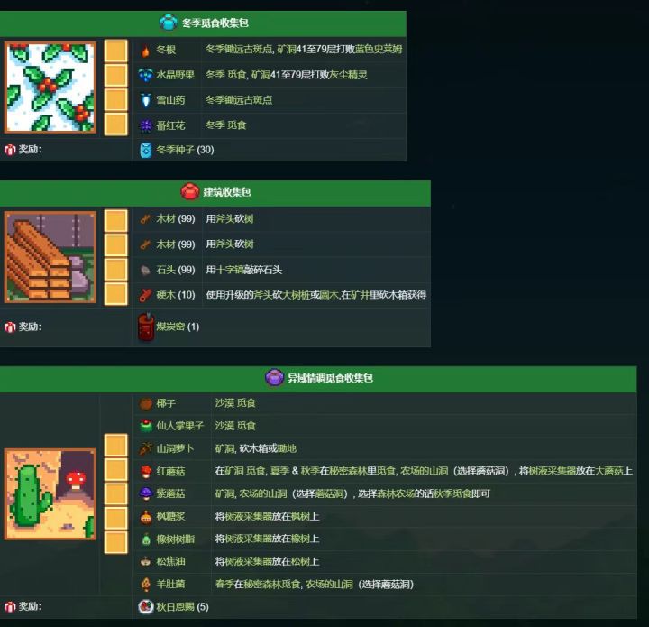 物品:椰子(沙漠觅食)、仙人掌果子(沙漠觅食)、山洞萝卜(矿洞砍木箱 / 锄地)、红 / 紫蘑菇(矿洞 / 农场山洞选蘑菇洞,森林农场秋季觅食)、枫糖浆(树液采集器放枫树)、橡树树脂(放橡树)、松焦油(放松树)、羊肚菌(春季秘密森林 / 农场山洞选蘑菇洞)
