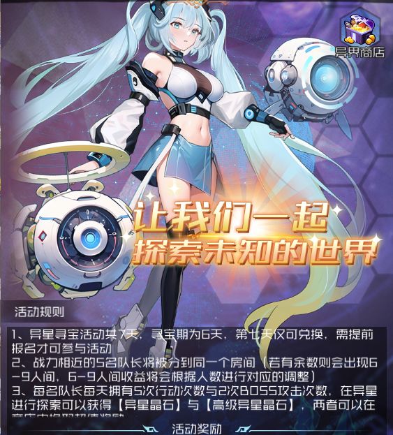 活动期间(异界寻宝共持续7天,寻宝期6天,兑换期1天,需提前报名),可在异界探索宝藏,采集异星晶石和高级异星晶石,用于在异界商店内兑换