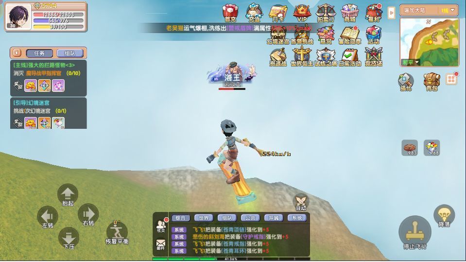 初次进入游戏,玩家将在帕里镇获得基础飞行器,通过简单教程掌握飞行要领。且对飞行控制系统进行了针对性优化:①双段滑翔机制:按住跳跃键进入滑翔状态,再次点击可消耗体力进行二段冲刺,实现更灵活的空中机动。②风压感知系统:角色头顶新增"风向标"UI,实时显示气流方向,顺风飞行速度提升40%,逆风下降30%,增加了环境互动性。③坠落美学设计:从高空坠落时可触发特殊"坠落技",如"螺旋下劈"对地面敌人造成范围伤害,将不利转为战术优势。世界boss玩法:顾名思义就是每日boss,而且是给全区的兄弟姐妹们一起打的一种boss。这种boss的血量非常的高,非常难打,只能说自己能打多少伤害,单凭个人根本不可能拿下的,当然风浪越大鱼越贵,个人伤害越高,奖励也越丰富,第一名除了给的金币奖励还有大量经验和buff奖励!