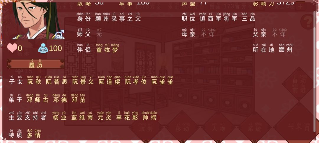 九年,镇西军元文简病逝,享年34岁,他凭借资深的资历和傲视群雄的能力(100点),如约获得了将军之位。