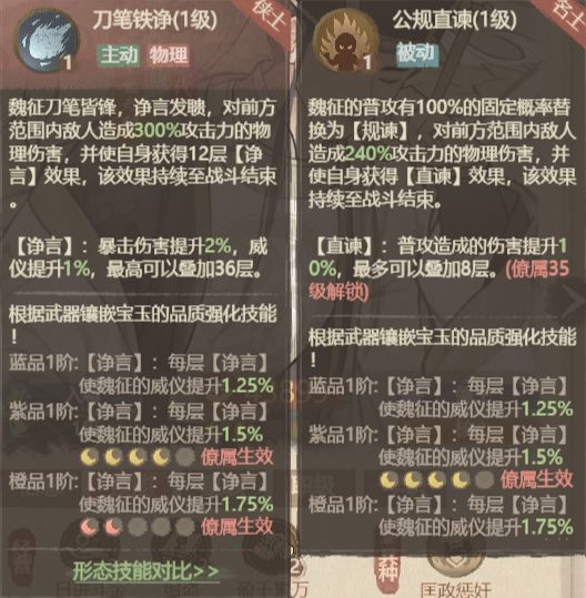 魏征作为天骄僚属,具有名士和侠士两种形态。与长孙无垢的官府/宗府形态差异显著不同,魏征的两种形态在核心机制上较为相似,但在细节和战斗风格上仍有明显区别。本文将详细分析两种形态的技能差异以及适用场景。