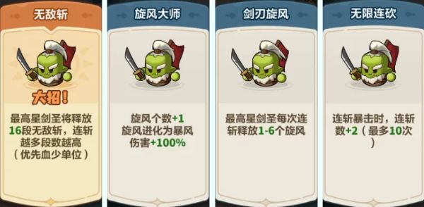 剑圣的大多数流派强化词条都是针对最高星剑圣进行提升,因此在战斗时先通过合成升星,尽快合成出高星剑圣,以“质”取胜。