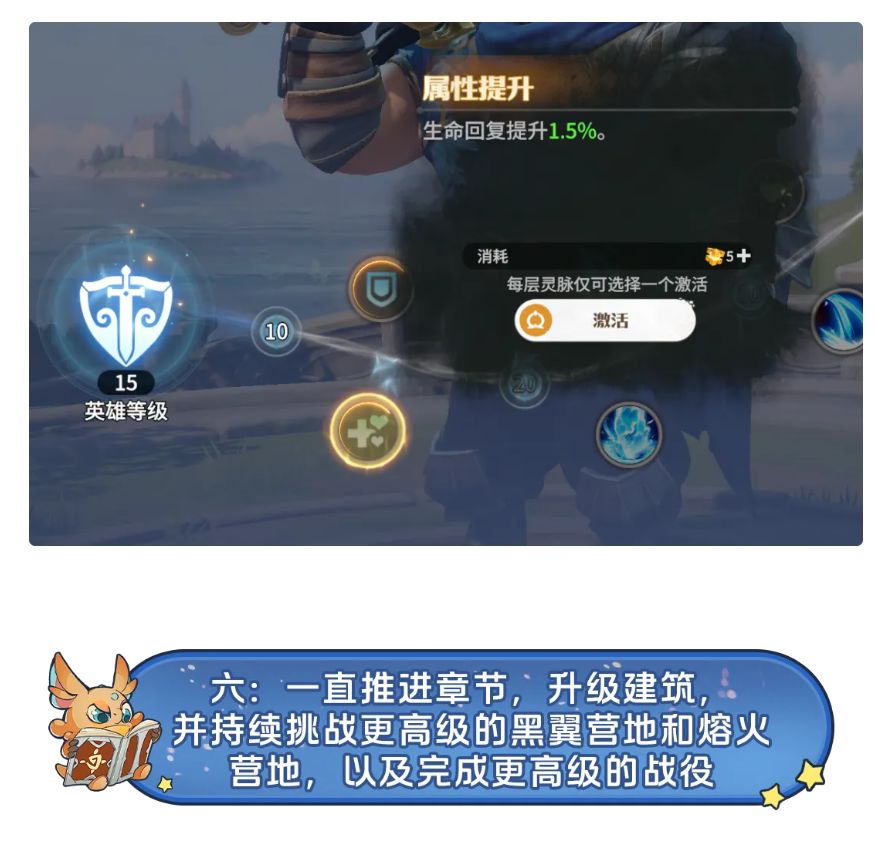 6.激活英雄灵脉:英雄灵脉每10级解锁,激活灵脉也可提升英雄战力。