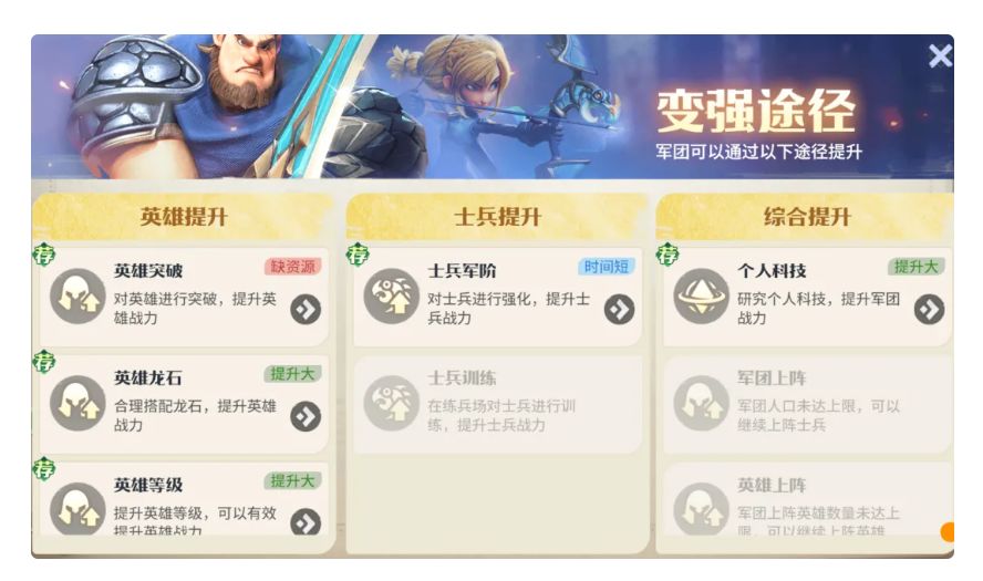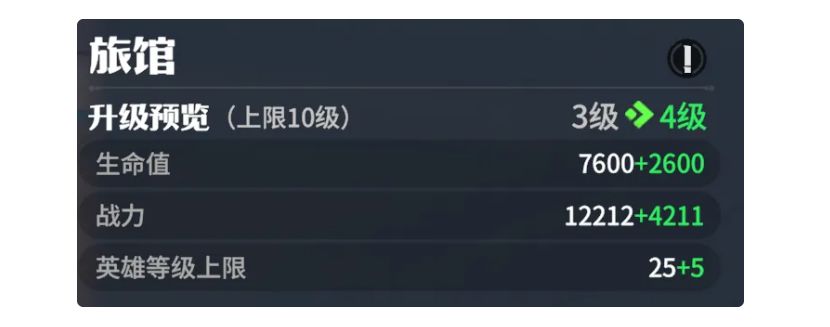 后续跟随任务章节逐步提升战力,当遇到卡关时,需要提升战斗力,提升战斗力方法如下:1.提升英雄等级:提升英雄等级可有效提升战力,注意英雄等级与旅馆挂钩,提升旅馆等级方可解锁英雄等级上限。