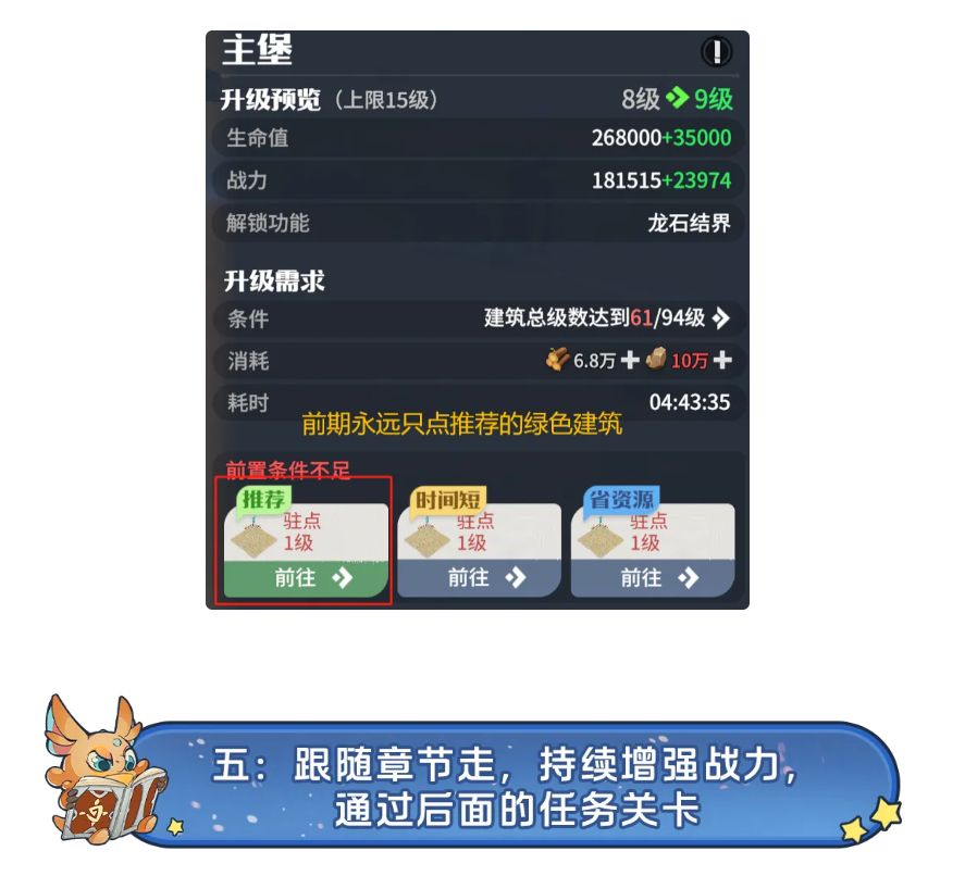 过完第七章,后续推荐章节有很多时候需要点建筑,而主堡升级往往挂钩了建筑总等级,当面临建筑等级不够,主堡卡住时,建筑优先点主堡升级界面绿色推荐的建筑。