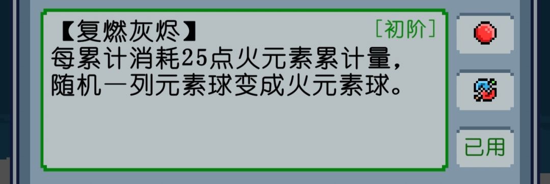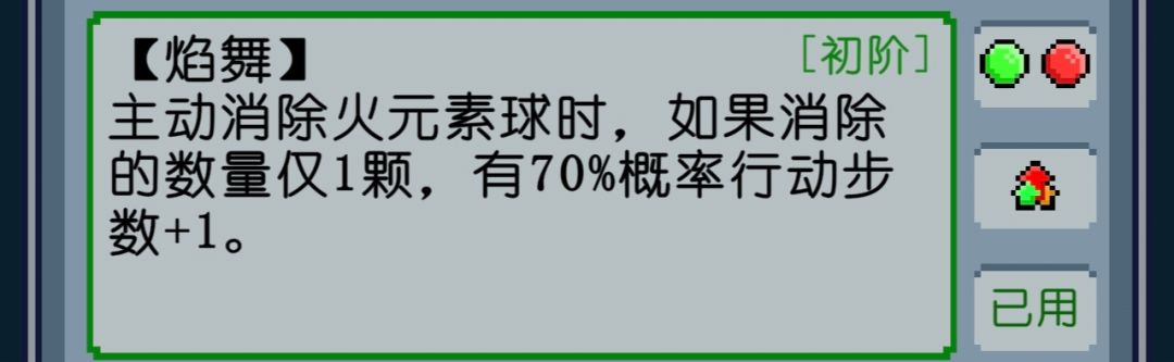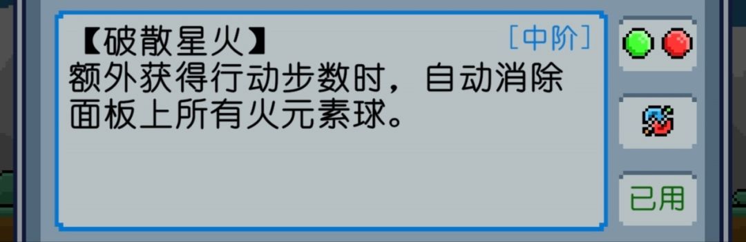 T1.5:破散星火(获得步数自动消耗所有火元素,配合焰舞,相当于有概率不消耗步数用掉所以火元素。配合焰舞一起提升0.5级别)