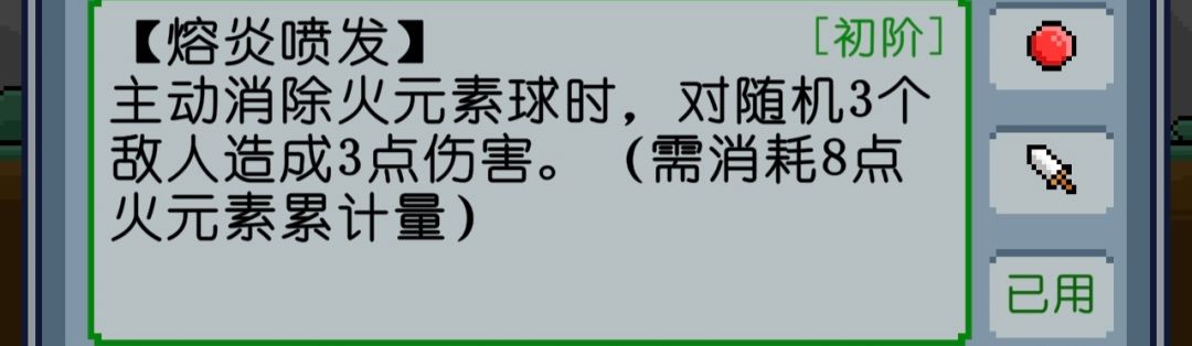 T2:其它一些像变火元素的技能、消耗火元素积累的技能有的话就拿。这些技能相对没那么重要,也比较多就不详细说明了,玩的多就知道哪些需要的了。还有一些回血、加伤害、减伤、消耗其它属性