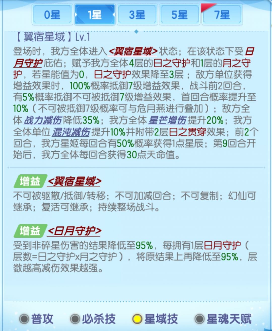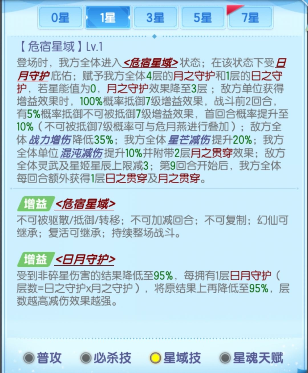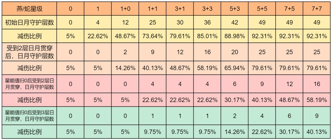 日月守护可以使我方受到非碎星伤害的伤害结果减少5%,每层日月守护则额外减伤1次,实际的减伤比例是1-95%^(1+日之守护*月之守护),下表展示了星域技各星级时日月守护的减伤比例,这个减伤在伤害计算中是独立乘区。